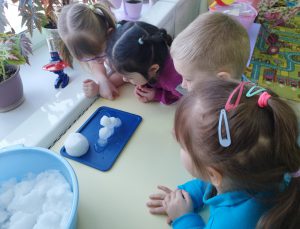 🎎В зимней лаборатории «Шустрики» исследовали снег и лёд, сравнивали их свойства, выясняли, где быстрее растает одинаковое количество снега, на ладошке или на варежке, и почему?